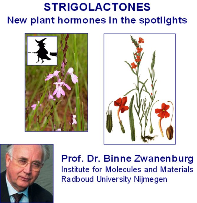 In this lecture first some historic highlights of Striga research will be presented. Then the strategy of the total synthesis of naturally occurring SLs will be discussed with a focus on stereochemical features, followed by the identification of the bioactiphore in SLs and the design of new bioactive SL analogues.