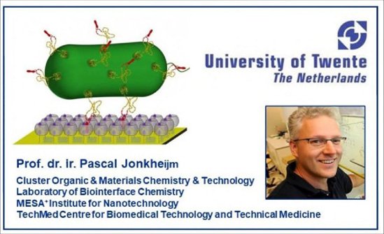 Jonkheijm (1978) obtained his PhD from the Eindhoven University of Technology (NL, 2005) with Prof. Dr. E. W. Meijer as advisor on macromolecular engineering of pi-conjugated oligomers into nanoscopic objects using supramolecular inter-actions. His thesis was awarded with the 2006 Houwink Award on Macromolecular Organic Chemistry. After that, Jonkheijm moved for a post-doctoral stay as an Alexander von Humboldt fellow to the Chemical Biology department of Prof. Dr. H. Waldmann (Germany, Max Planck Institute for Molecular Physiology). His research interests included protein microarrays and surface microstructuring techniques. In 2008 he became Assistant Professor in the Molecular Nanofabrication group of Prof. Dr. J. Huskens at the University of Twente and MESA+ Institute for Nanotech-nology. In 2013 he was appointed there as Associate Professor and in 2019 he was installed there as Full Professor in Organic Chemistry. In 2017 he has been a visi-ting Professor at the Institute of Biomaterials and Biomedical Engineering, Univer-sity of Toronto, Canada. He received career development grants for early (VENI, 2008) and experienced (VIDI, 2013) researchers of the Dutch Innovation Research Incentive Scheme. He received the Young Investigator Award of the Biomedical Materials Program (2010) and a Starting Grant of the European Research Council (2010). He has recently received (2018) the Gold Medal of the Royal Netherlands Chemical Society. Present research interests include: cell-instructive biointerfaces, self-assembly, cell-surface interactions, dynamics, organic materials, biomimetics. He is (co)author of over 125 refereed research papers and two granted patents. He explores commercial potentialities through three ERC Proof-of-Concept grants (2017, IMPLANTaLife; 2014, BioStealth; 2012, Multichip) and co-founded in 2016 Li-pocoat B.V, a high tech spin-off that commercializes bio-inspired coatings for healthcare applications. http://www.jonkheijm.org
