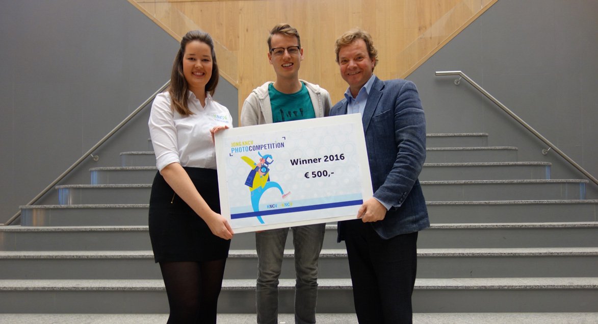 donderdag 22 december 2016 De Jong KNCV Fotocompetitie 2016 is gewonnen door Bas Buise, masterstudent aan de TU Delft. Zijn foto van de meer controversiële kant van chemie kreeg op CHAINS 2016 de meeste stemmen van de bezoekers. KNCV-directeur Jan-Willem Toering en Jong KNCV-bestuurslid Yacintha Vermeer reikten donderdag de cheque ter waarde van 500 euro uit aan de winnende fotograaf.