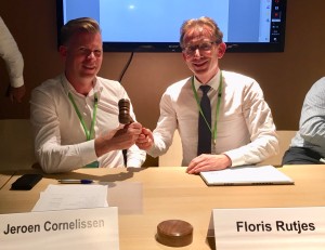 Aansluitend aan de onthulling van het Chemisch Erfgoed was de Algemene Ledenvergadering. Hier vond ook een belangrijke gebeurtenis plaats, namelijk de overdracht van het voorzitterschap. Floris Rutjes gaf na drie jaar de voorzittershamer over aan Jeroen Cornelissen. Floris zal nog in het bestuur actief blijven als past-president.