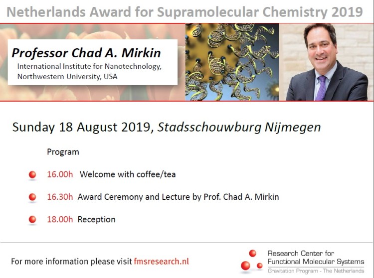 Van 18 t/m 20 augustus organiseert het Research Center for Functional Molecular Systems (FMS) het tweede International Conference on Molecular Systems Engineering (ICMSE 2019) in Nijmegen. Tijdens deze conferentie vindt ook de uitreiking van de Netherlands Award for Supramolecular Chemistry plaats met aansluitend een lezing. Dit jaar gaat deze prijs naar Prof. Chad Mirkin. Hoewel onderdeel van de conferentie, is deze lezing op zondag 18 augustus vrij toegankelijk voor alle geïnteresseerden.